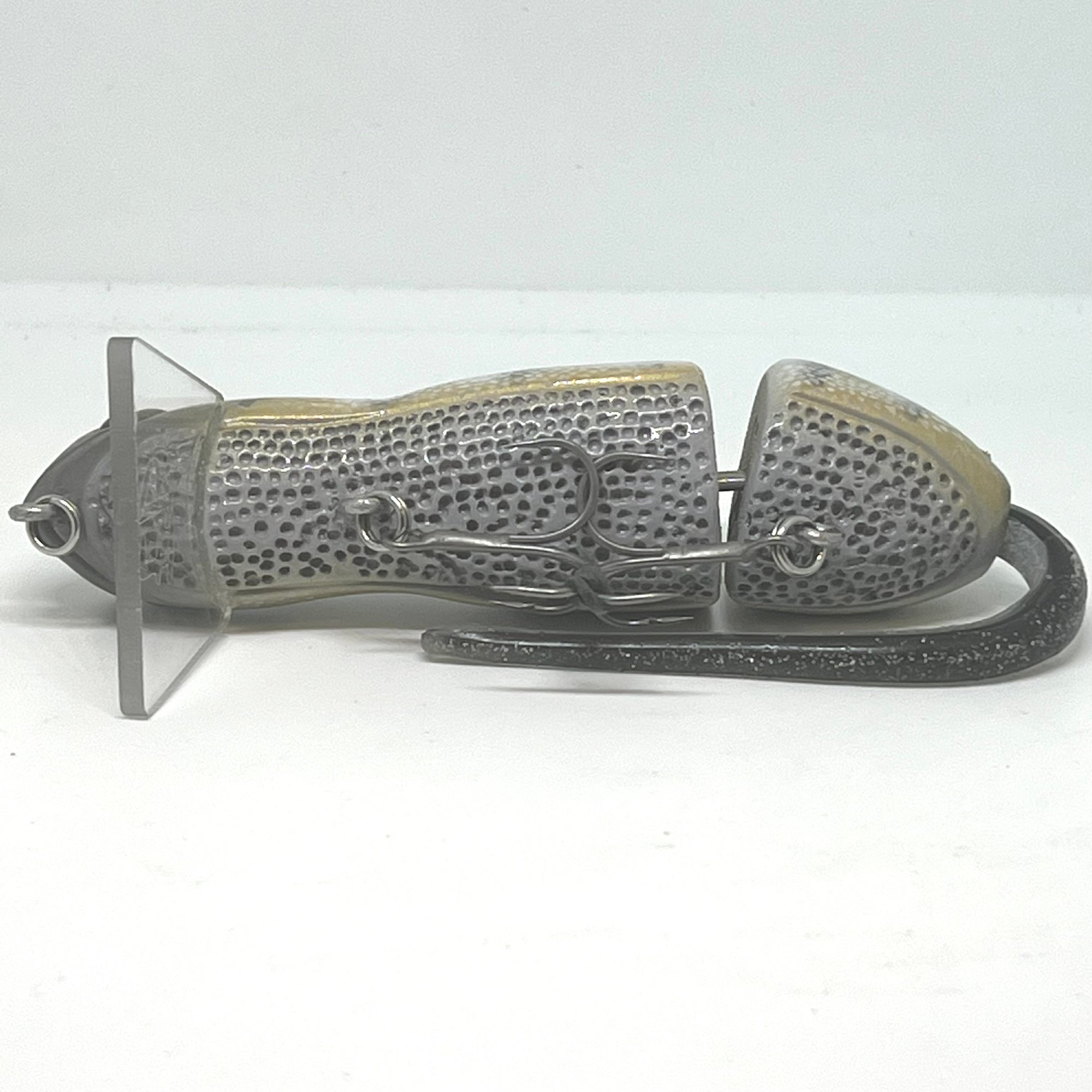 This handmade bait comes in at 2 ounces fully rigged, including a 5 inch body and 4 inch replaceable tail. We use top of the line components, including Swimbait Underground size 2 ST-36 hooks. You're ready to go, right outta the box. Wake it slow, shallow crank it, or dive it down a few feet. This is a wake/shallow crank. You can walk it on top, or even crank it down and then walk it. It's extremely versatile.