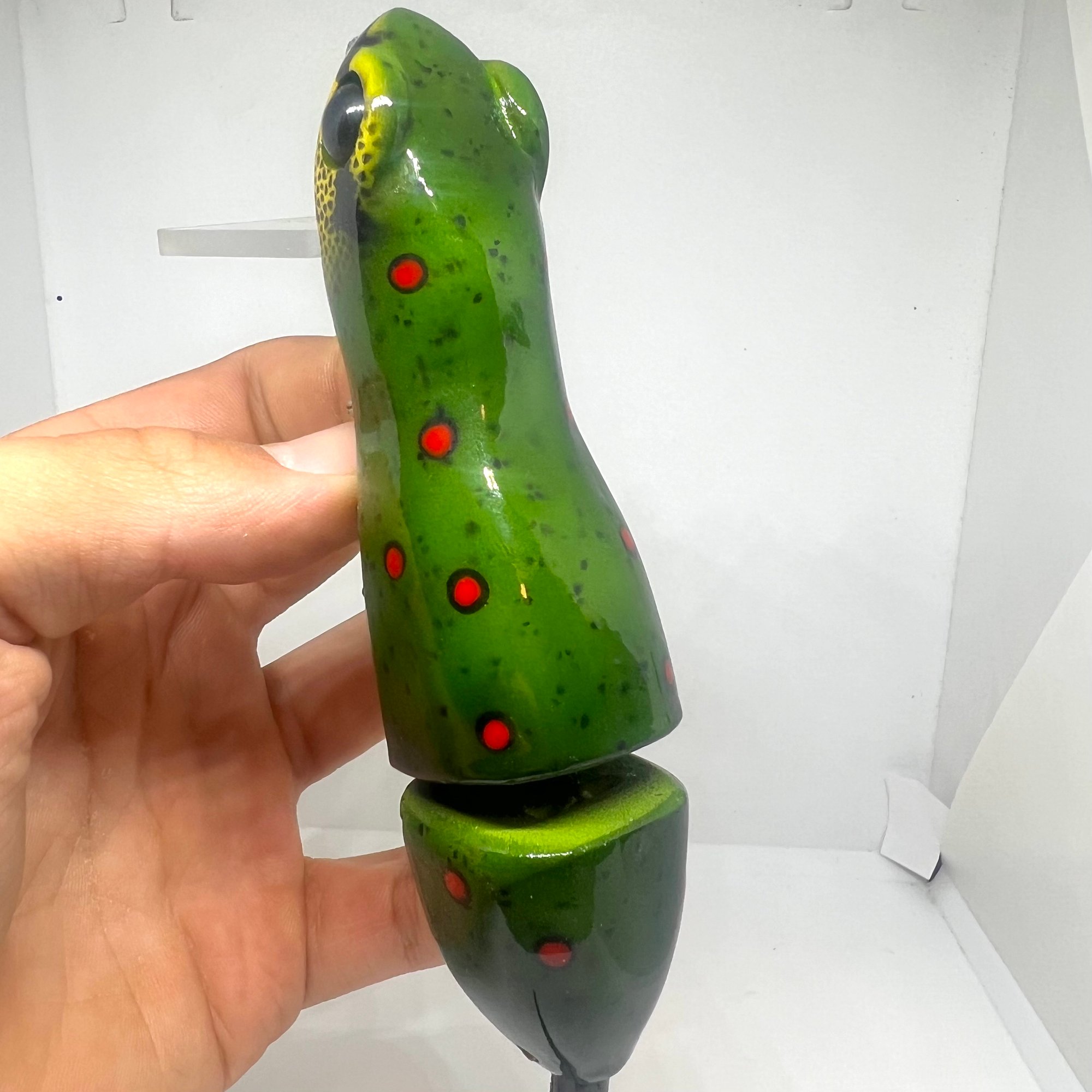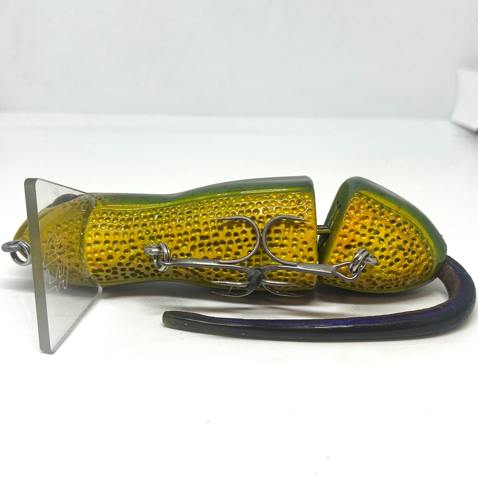 This handmade bait comes in at 2 ounces fully rigged, including a 5 inch body and 4 inch replaceable tail. We use top of the line components, including Swimbait Underground size 2 ST-36 hooks. You're ready to go, right outta the box. Wake it slow, shallow crank it, or dive it down a few feet. This is a wake/shallow crank. You can walk it on top, or even crank it down and then walk it. It's extremely versatile.
