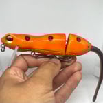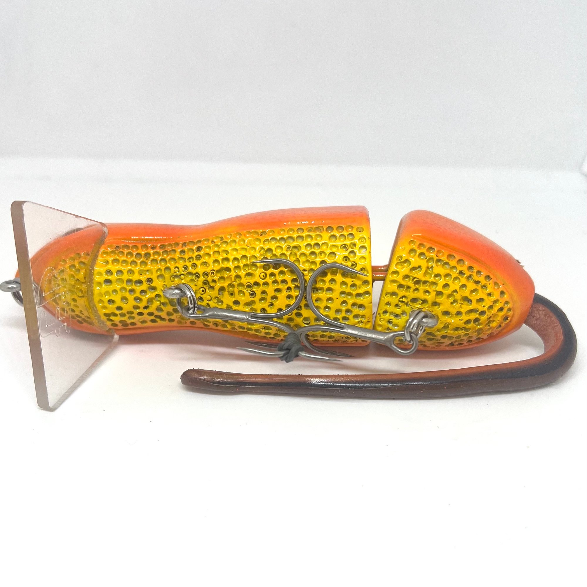 This handmade bait comes in at 2 ounces fully rigged, including a 5 inch body and 4 inch replaceable tail. We use top of the line components, including Swimbait Underground size 2 ST-36 hooks. You're ready to go, right outta the box. Wake it slow, shallow crank it, or dive it down a few feet. This is a wake/shallow crank. You can walk it on top, or even crank it down and then walk it. It's extremely versatile.